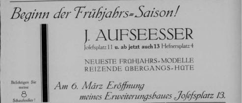 In der Nürnberger Altstadt, am Josefsplatz 11, betrieb er das „Putz- und Modewarengeschäft J. Aufseeßer“. Später kam in unmittelbarer Nähe ein weiteres Ladenlokal am Hefnersplatz hinzu und es erfolgte noch eine Geschäftserweiterung am Josefsplatz 13.